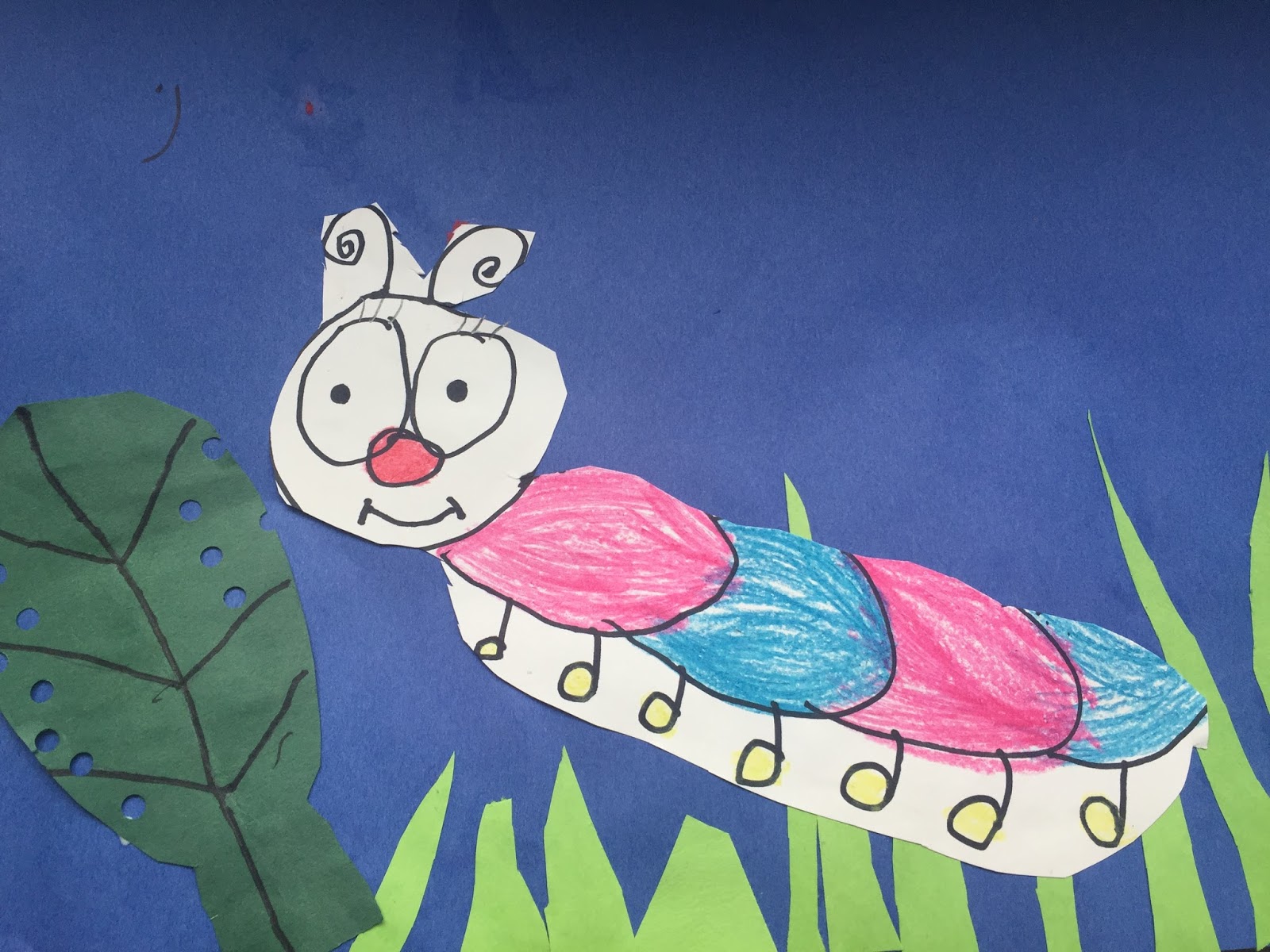 Kindergarten read the book The Very Hungry Caterpillar. They learned how to draw their own caterpillars and collaged it together with a background.